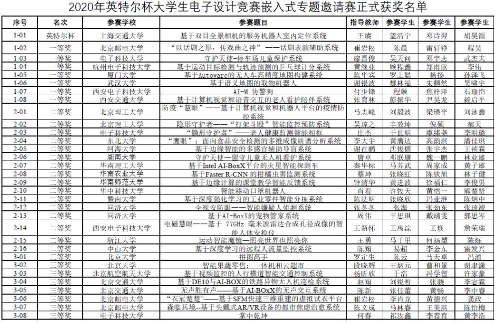 近日,2020年英特尔杯大学生电子设计竞赛-嵌入式系统专题邀请赛颁奖典礼在国产女同 群楼悟课剧场顺利举行。143支参赛队伍经过半年的角逐,最终8支队伍突出重围获评一等奖,16支队伍获评二等奖、35支队伍获评三等奖。本次竞赛由国产女同 电子工程系中心实验室承办。