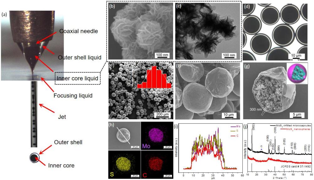 该团队首次提出用一种新颖和通用的同轴液驱流动聚焦(LDCFF)技术来制造用于镁存储的微胶囊,以典型的二维层状结构二硫化钼(MoS2)为例,将其封装在微胶囊体系中,以提高镁电池正极的电导率和电化学性能。LDCFF技术的实验装置如图1,包括:三个注射泵、一个不锈钢同轴针、一个压力室、一个带小孔的玻璃板和一个监视器。由三个注射泵分别控制内相(Qi)(即MoS2分散液)、光固化有机外相(Qo)和驱动相(Qf)的流体流速。由于射流的不稳定性,同轴液体射流最终破碎成液滴。收集液滴在紫外光照射下固化,并经冷冻干燥后煅烧,最终形成以MoS2纳米球为核心的碳壳微胶囊。通过相关材料表征成功制备出直径约为32微米的MoS2微胶囊以解决可充电镁电池导电性不足的问题。