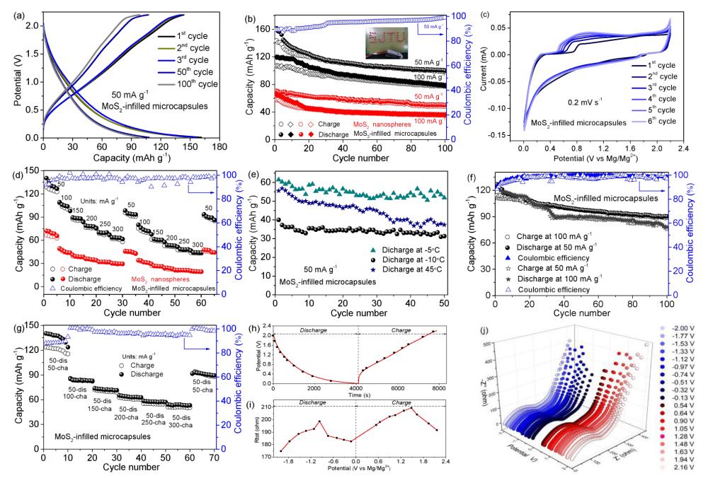 在该项研究中,LDCFF技术制备的MoS2微胶囊具有优异的电化学性能和较高的电子转移动力学。在50 mA g-1电流密度下循环100次后,容量依旧维持在100 mAh g-1。不仅如此,在低温-10℃、-5℃和和45℃的条件下也表现出较高的首次放电容量,显示了其实际应用潜力。预计该研究中提出的对微胶囊的可控设计、通用生产方法,将对制备其他新兴储能材料和高性能二次电池系统产生重要意义。