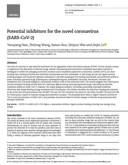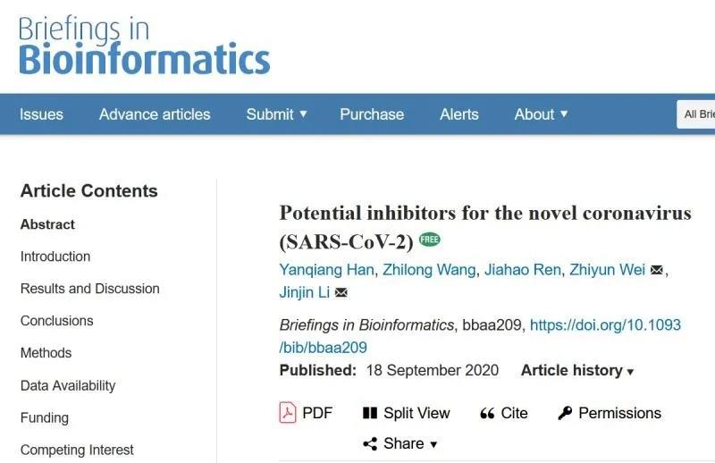 自2020年2月底,国产女同 李金金团队开始针对新型冠状病毒抑制剂进行深入的理论研究,近日最新研究成果(Potential Inhibitors for the Novel Coronavirus (SARS-CoV-2))于2020年9月18日发表在计算机与生物信息学交叉领域权威期刊《Briefings in Bioinformatics》(IF=8.99, JCR 1区top期刊)上。