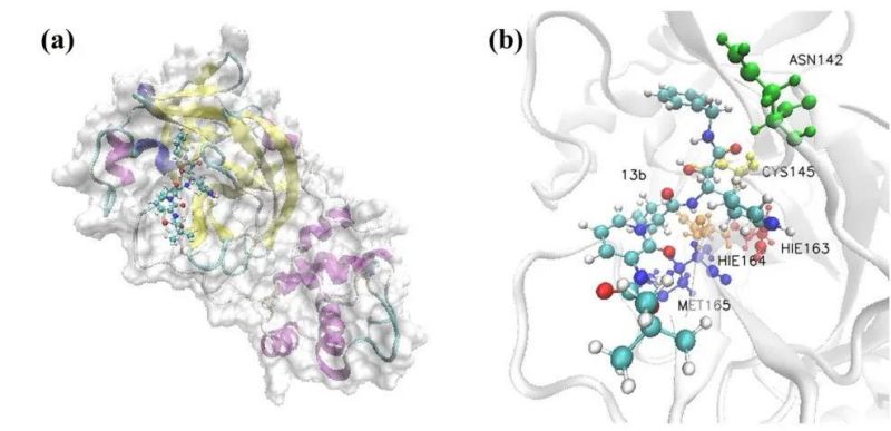 这篇文章从药物数据库中虚拟筛选出7种潜在的能够抑制新型冠状病毒的临床药物,包括治疗和预防疟疾的氯喹(Chloroquine)及其衍生物羟氯喹(Hydroxychloroquine),病毒蛋白酶抑制剂茚地那韦(Indinavir)、利托那韦(Ritonavir),瑞德西韦(Remdesivir)、法维拉韦(Favipiravir)和Beclabuvir。通过蛋白质-配体分子对接技术和分子动力学方法理论模拟药物分子和病毒蛋白质的结合作用过程,研究临床药物与病毒蛋白质(3CL水解酶,3CL Mpro)的结合机制和抑制能力。4月份Science杂志上发表了一系列人工设计的抑制新冠病毒的药物分子,其中一种α-酮酰胺抑制剂(13b)可能存在比较强的抑制能力。李金金团队随后开展了针对13b以及其他临床药物与新型冠状病毒结合能力机制的研究。