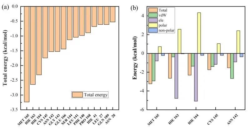 该文章还详细研究了药物分子和新型冠状病毒蛋白的结合作用机制,通过分子对接手段确定了不同药物分子与病毒蛋白结合的位点信息,以及蛋白质残基对结合能力的贡献程度。研究的8种抑制剂分子都会倾向于与病毒蛋白结合在相近的位点。对于结合能力最强的13b分子,病毒蛋白残基MET165和HIE163对于药物与病毒结合的贡献最大,其中残基MET165贡献主要是范德华相互作用,HIE163主要贡献是静电能。文章所研究的药物分子和3CL水解酶的结合机制以及残基对结合能的贡献分析可以为后续药物研究提供理论基础,并指导新冠病毒抑制剂的设计,研制出针对新冠肺炎治疗效果更好的药物。