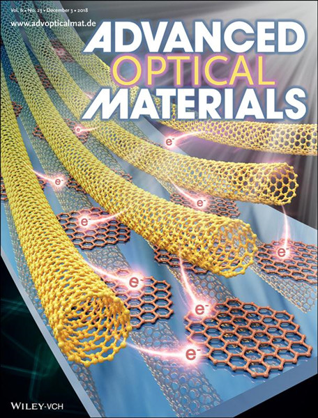 近日,国际著名学术期刊《Advanced Optical Materials》以封面文章形式“All-Carbon Photodetectors: Highly Sensitive Broadband Single‐Walled Carbon Nanotube Photodetectors Enhanced by Separated Graphene Nanosheets (Advanced Optical Materials 23/2018)”发表了国产女同 电子信息与电气工程学院薄膜与微细技术教育部重点实验室苏言杰课题组在全碳Van de Waals异质结高性能宽光谱光电探测方面取得的取得了突破性进展。硕士研究生蔡葆昉为论文第一作者,苏言杰副研究员为论文通讯作者。