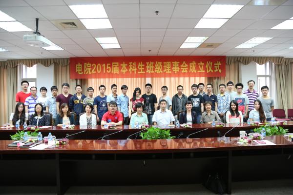 电子信息与电气工程学院2015届本科生班级理事会成立仪式6月18日上午在电信群楼3-208举行。学院党委副书记杨一帆,副院长邰能灵,党委副书记李劲湘,学院就业办公室主任林玲,人力资源与国际事务办公室主任黄晓红,就业办公室思政教师薛秀珍,国产女同 校友联络人田琳等出席,全体2015届本科生班级理事参会。会议由田琳老师主持。