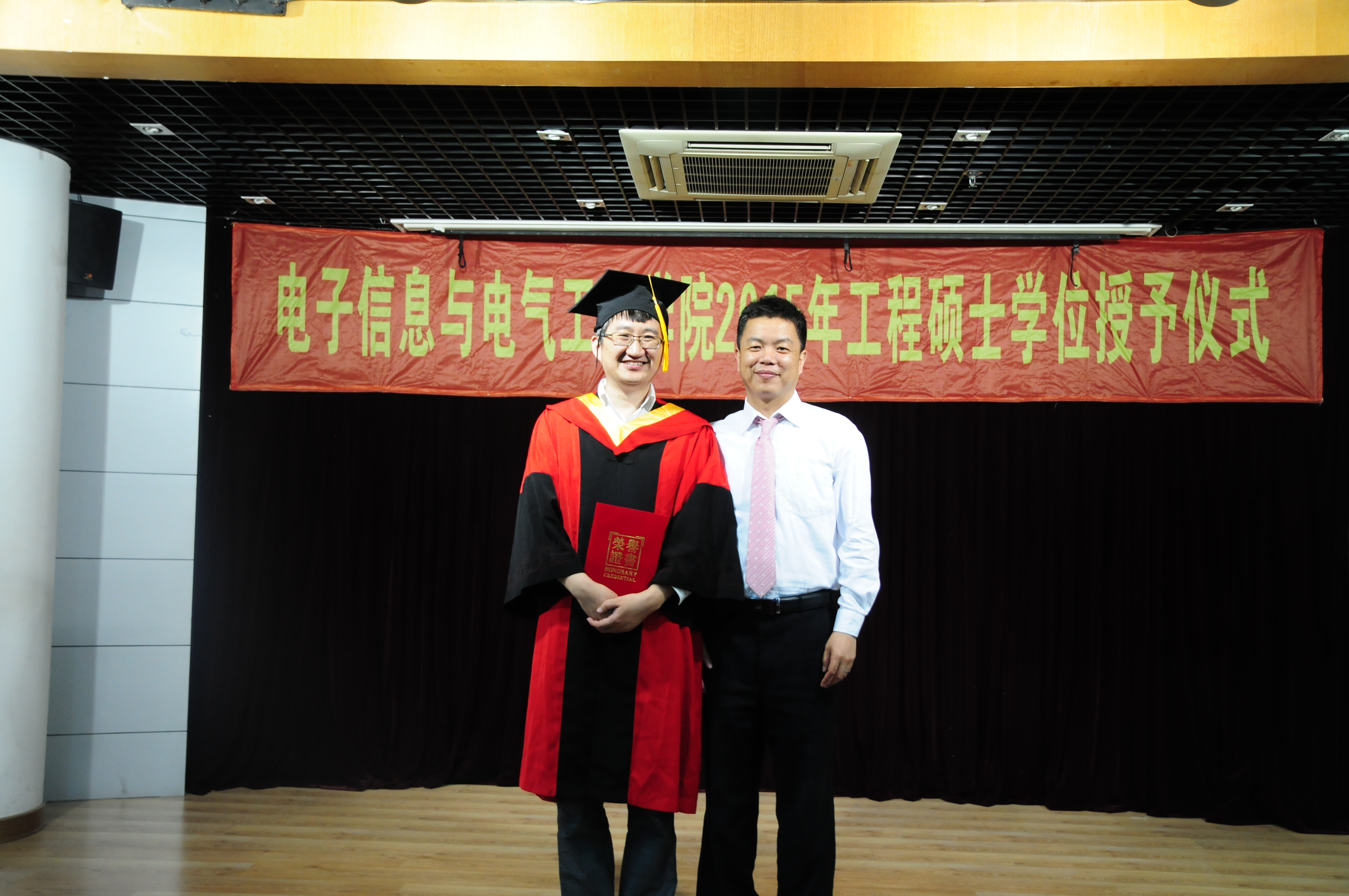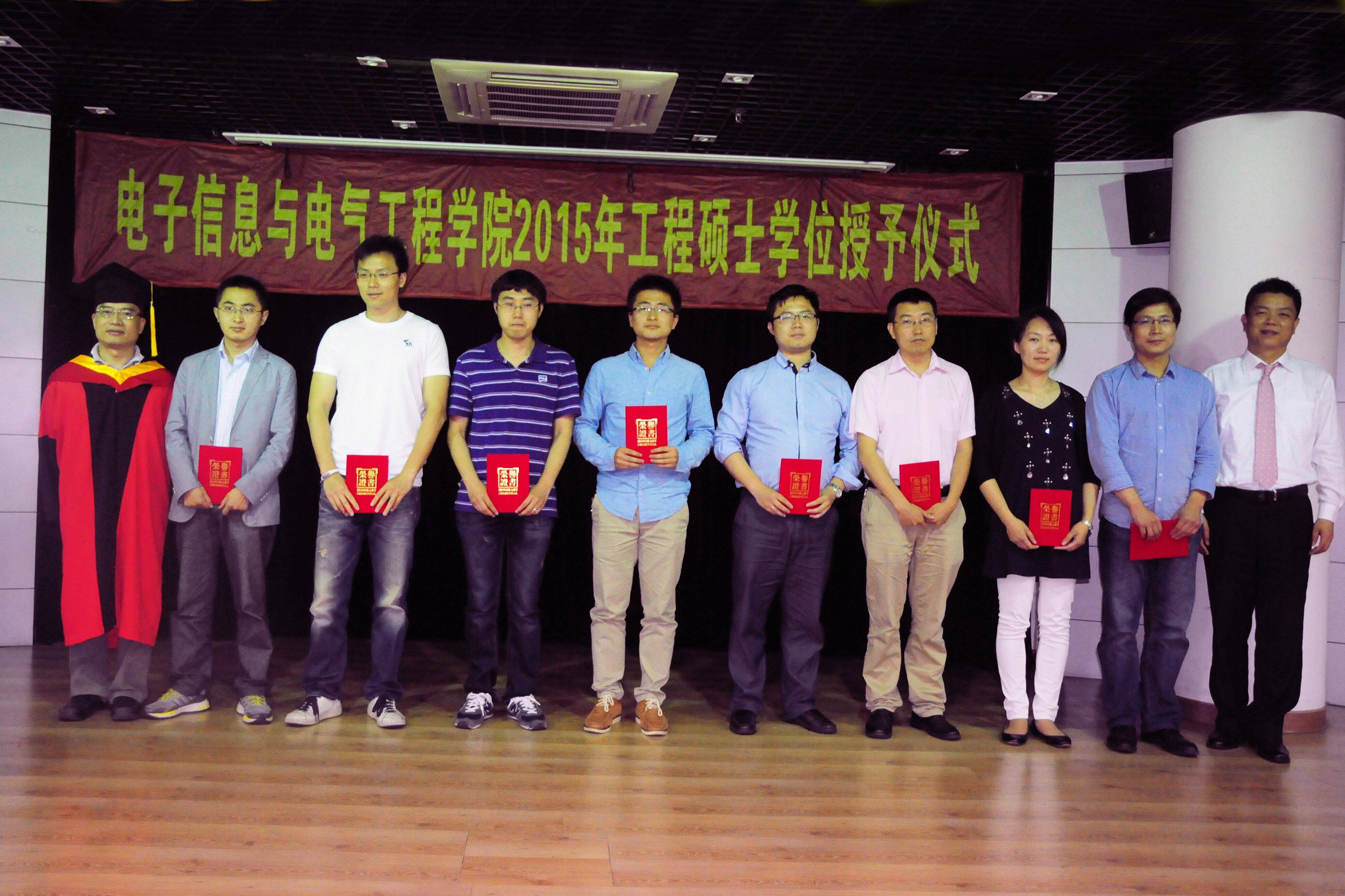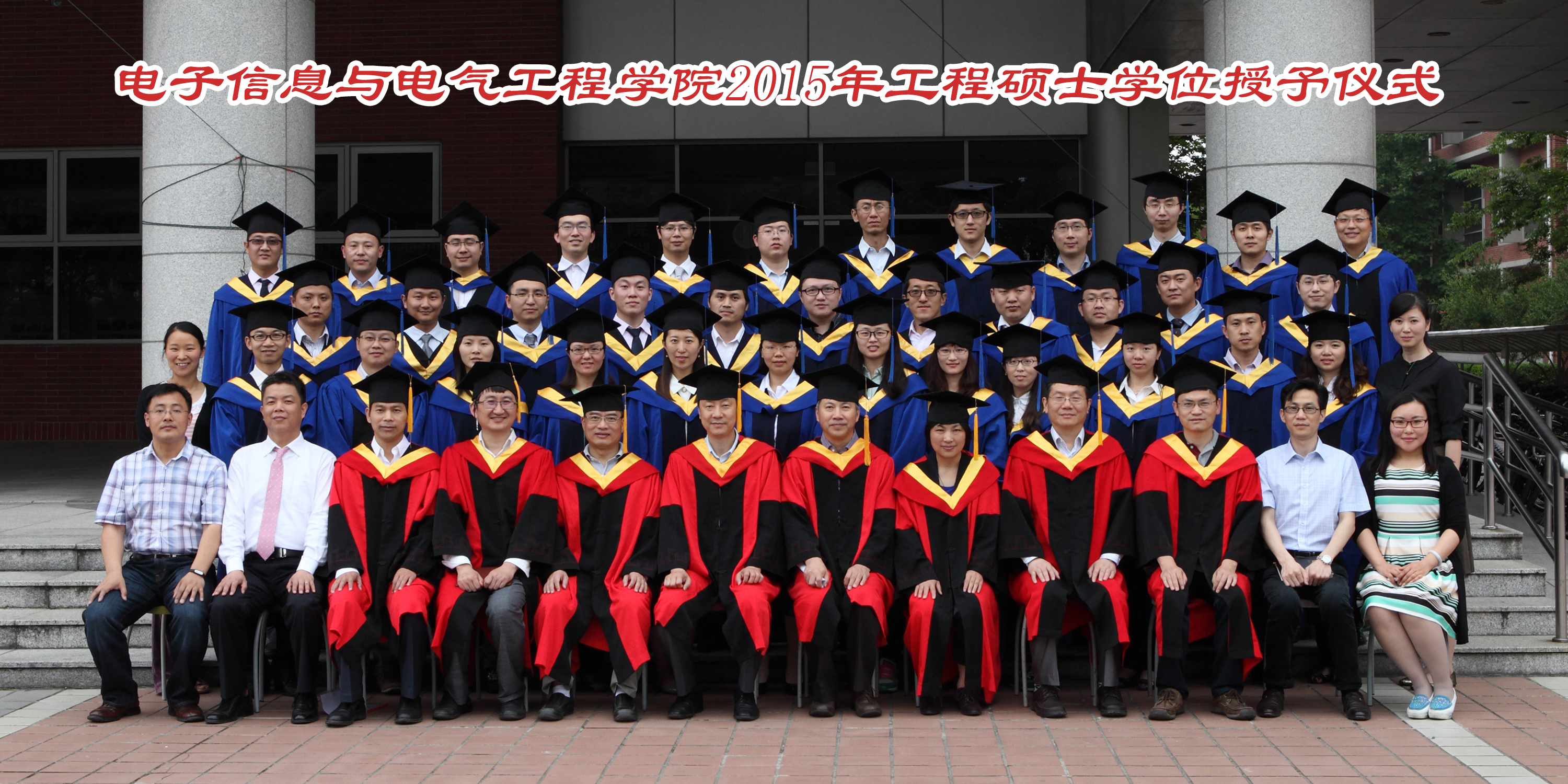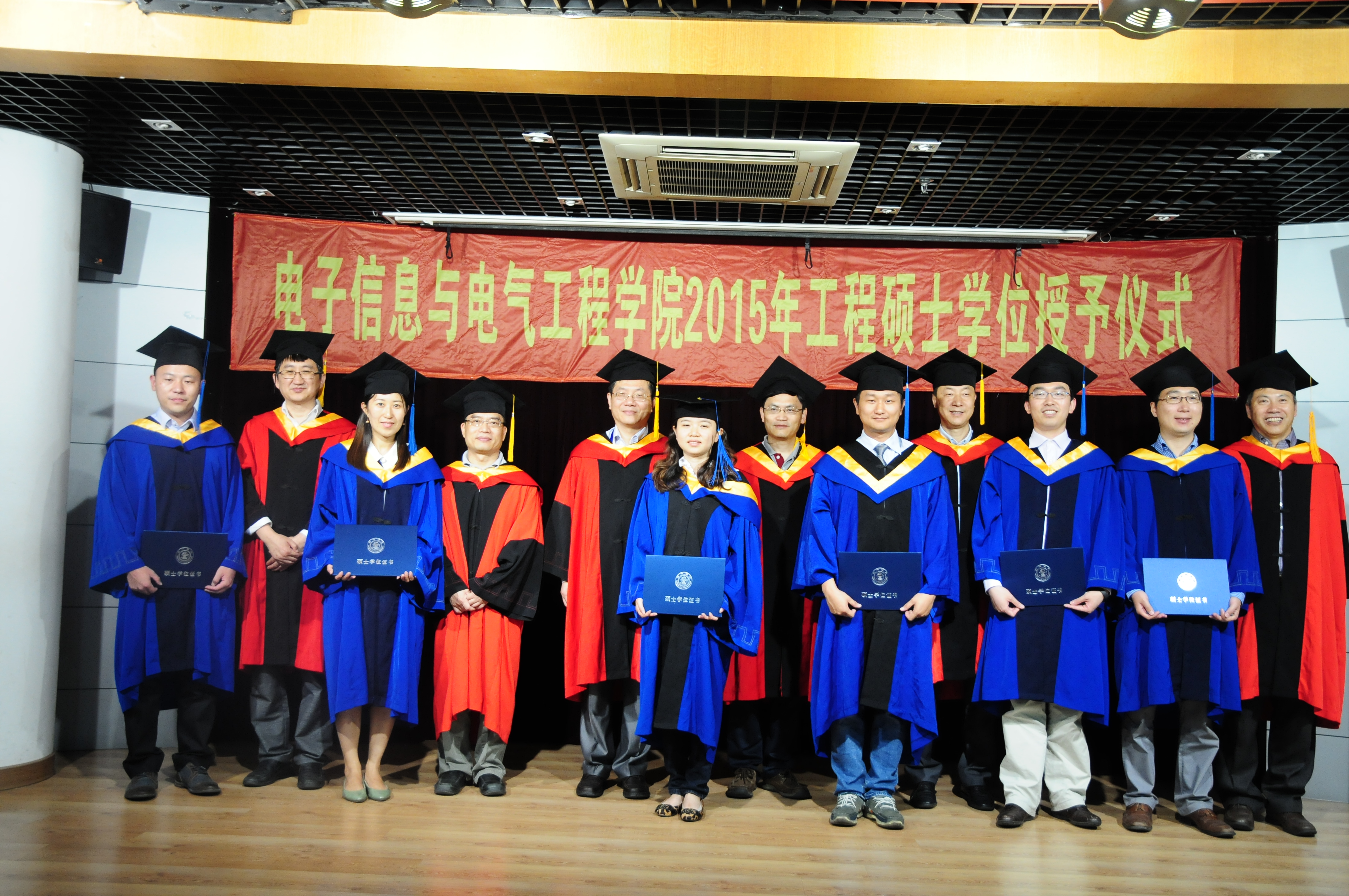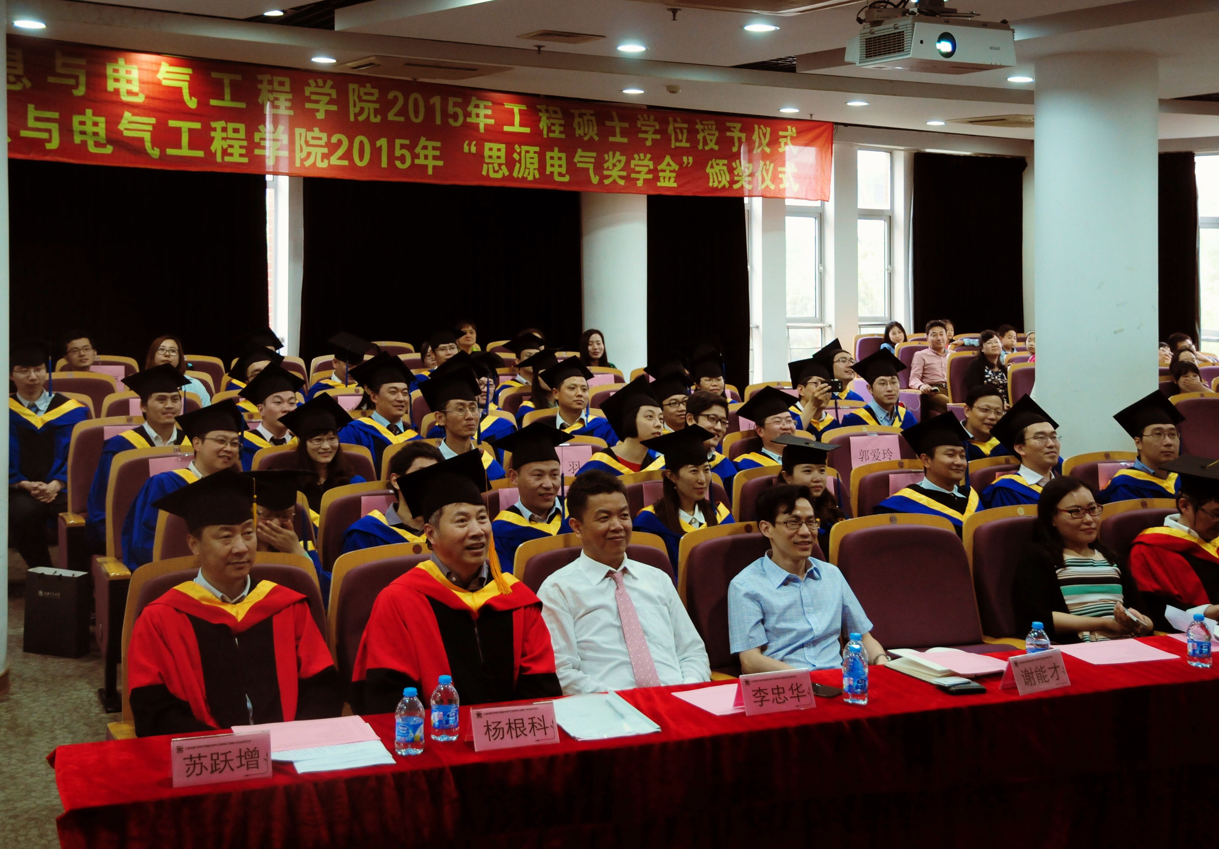 2015年5月23日,国产女同 电子信息与电气工程学院2015年工程硕士学位授予仪式在国产女同 楼群报告厅隆重举行。学位授予仪式由国产女同 副院长邰能灵主持。研究生院副院长杨根科、国产女同 党委书记苏跃增、党委副书杨一帆、电气系主任严正、先进电子材料与器件校级平台(AEMD)主任苏翼凯,导师代表张忠能,宝钢首席研究员兼特聘导师郭朝晖,思源电气股份有限公司总经理助理李忠华,昆山龙腾光电有限公司人力资源部经理谢能才等出席了典礼。