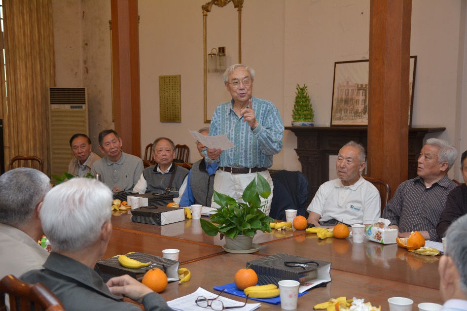 上午9点30分茶话会正式开始,校友们首先观看了倪学长悉心制作的PPT。他向大家展示了电制专业55级校友60年来的风貌,其中包括许多珍贵的老照片。图片中都是当年风华正茂,指点江山的莘莘学子,看到此处许多校友纷纷走近屏幕寻找着自己当年的身影。随后,几位毕业后第一次参加聚会的老校友们都发表了讲话,回忆当年入校的情景,感慨时代的变迁,同窗缘分的可贵。周康达校友详细描述当年考上交通大学的不易以及自己报考交大时的心情,回忆自己接到录取通知书时高兴的都跳了起来。宋慕渝学长总结了四个字来形容大家参加同学聚会时的心情:忆、情、纯、恋,引起了在场所有人的共鸣。薛继汉校友讲述了自己毕业后的人生经历,并且倾情作诗一首献给当天的第五次同学聚会:“有幸考进大学堂,莘莘学子奏学章,吴侬软语舒心境,关中秦腔豪气爽,甲子一轮又聚会,挚友频频道健康,相聚惜别欢恨短,再读五年又何妨,”表达了自己对母校的热爱之情以及老友重逢的激动心情。