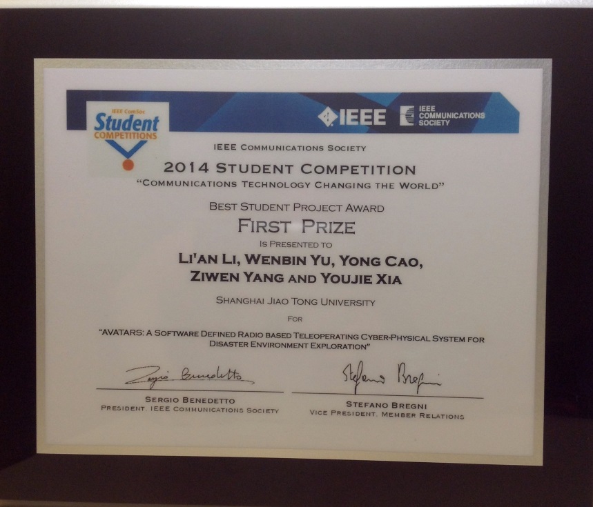 从2014年12月在美国奥斯丁举行的IEEE全球通信会议(Globecom’14)传来喜讯,交大国产女同 自动化系关新平教授领导的“智能无线网络与协同控制研究中心”学生竞赛团队—i-WIN团队力压MIT等名校队伍,凭借其名为“阿凡达”的“软件无线电远程控制信息物理系统”(AVATARS: A Software-Defined Radio based Teleoperating Cyber-Physical System for Disaster Environment Exploration)荣获“2014 IEEE通信学会学生竞赛”全球冠军!自动化系博士生李立安作为IEEE通信学会全额资助的唯一获奖代表,前往美国参加Globecom’14并获颁奖状和奖金。
