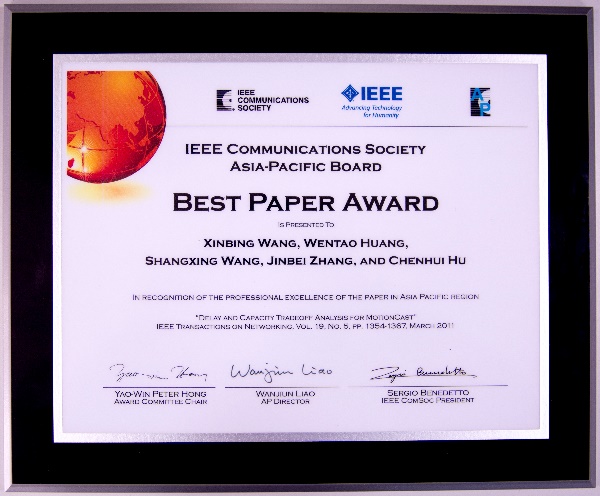 王新兵老师和其指导学生的联合论文题为“移动多播网络中时延和容量性能的折中分析”(Xinbing Wang, Shangxing Wang, Jinbei Zhang, and Chenhui Hu, “Delay and Capacity Tradeoff Analysis for Motioncast,” IEEE/ACM Transactions on Networking, Vol. 19, No. 5, pp. 1354-1367, Mar. 2011)的荣获了第三届IEEE通信学会亚太区杰出论文奖(3nd IEEE ComSoc Asia-Pacific Outstanding Paper Award)。该奖项于2012年成立,奖励过去三年内亚太地区学者发表在IEEE通信学会所属期刊和国际会议上有影响力的原创论文,本年度从众多候选论文中遴选出了三篇杰出论文,其中该获奖论文是中国大陆地区唯一一篇。获奖论文首次提出了随机移动多播(MotionCast)的机制,发现“冗余”是随机移动多播时间和空间转换的媒介,研究结果填补了网络信息理论中多播和移动双维度并存下的结果。