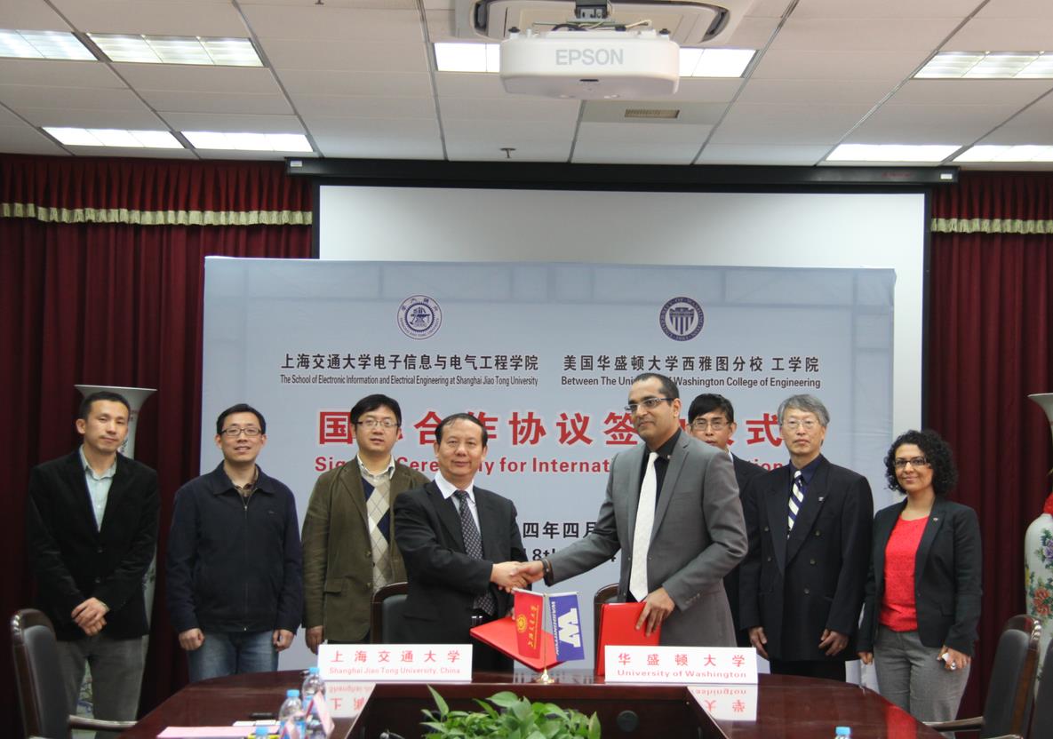 2014年4月8日上午,国产女同 电子信息与电气工程学院与美国华盛顿大学西雅图分校工学院代表团在国产女同 208会议室正式签订两院合作备忘录。参加签约仪式的有华盛顿大学工学院电气工程系主任Vikram Jandhyala教授、负责工学院发展联络的Mahnaz Sherzoi主任、负责科研合作的副主席Jenq-Neng Hwang教授;以及上海交大国产女同 院长毛军发教授、国产女同 副院长李少远教授、现在国产女同 任职的美国华盛顿大学毕业生 - 国家青年李小勇、沈漫源,和林巍峣副教授等。