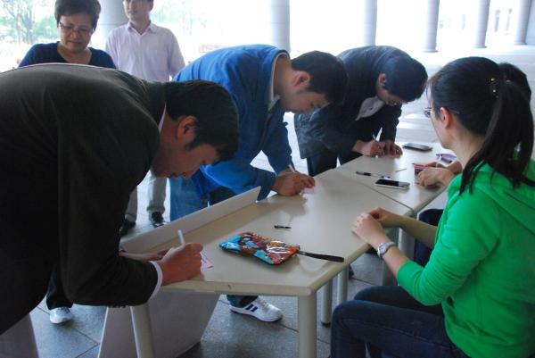 午饭过后教职工们在电信群楼三号楼前领取健康行卡片,填上自己的姓名,在院工会主席莫光成的带领下加入“行走国产女同 ”的队伍。