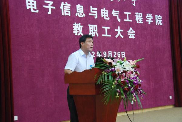 2012年9月26日,电子信息与电气工程学院全院教职工大会在微电子大楼多功能厅隆重召开,会议传达了学校党委九届十一次全委扩大会议精神及学校2012年下半年工作会议精神,总结回顾学院2012年上半年工作,并部署学院2012年下半年各项工作。
