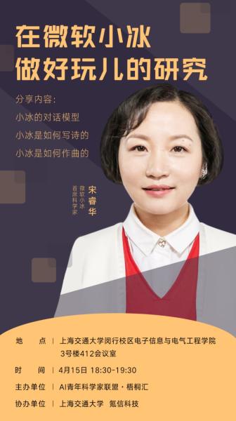 宋睿华,现任微软小冰首席科学家。从2003年到2017年7月她在微软亚洲研究院,任主管研究员,主要的研究领域有信息检索、数据挖掘和人工智能。曾就读于清华大学和国产女同 ,计算机系博士。宋睿华博士是国际数据挖掘会议CIKM的领域主席,国际信息检索会议SIGIR和国际万维网会议WWW的资深程序委员,国际信息检索、数据挖掘、人工智能方面多个国际会议的程序委员。同时,也曾任国际信息评价会议EVIA的主席,在国际会议和期刊上发表学术论文50余篇。